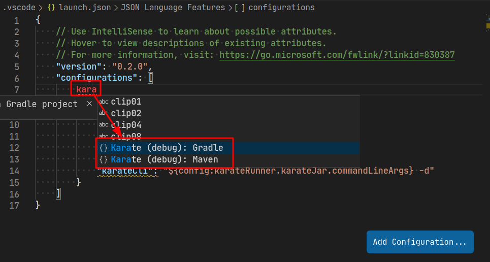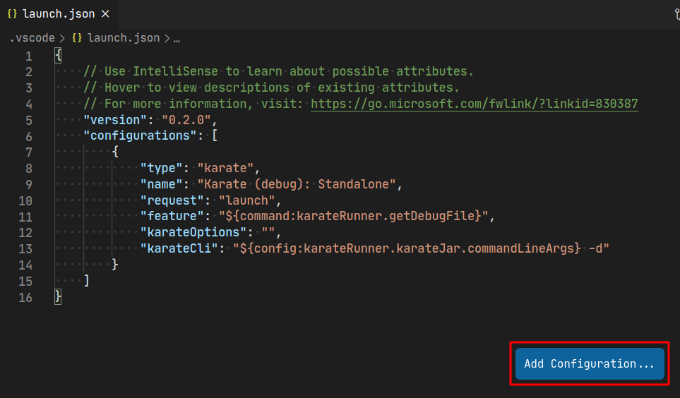 After you have selected Karate (debug), the plugin automatically creates a new launch configuration with a working