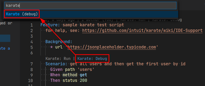 To do so, click on Karate: Debug Codelens, type karate in the search input field and select Karate (debug) as you can