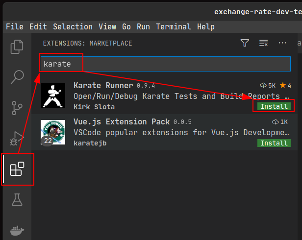 If you haven’t already installed the Karate VS Code plugin-in, go to the extension view, search for karate, and click on install.