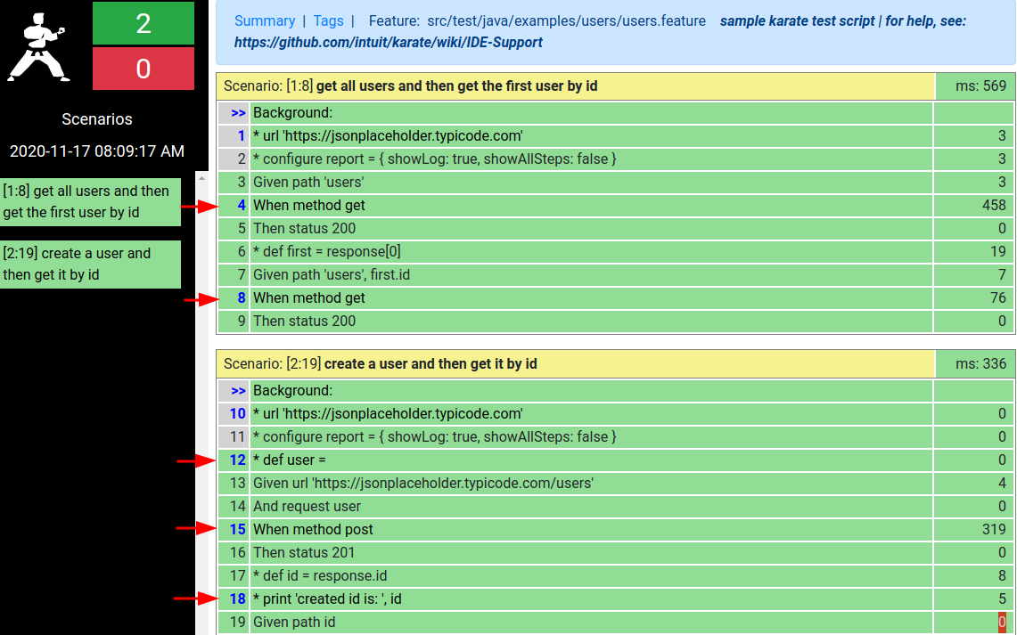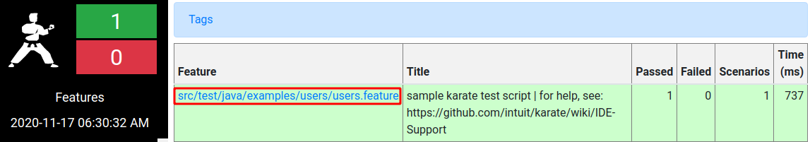 Karate generates an HTML report that provides a more visual overview of the executed Features & Scenarios and that helps you in case your CI pipeline failed to track down the cause. The last message on the standard printed by karate is a quick link to that report: